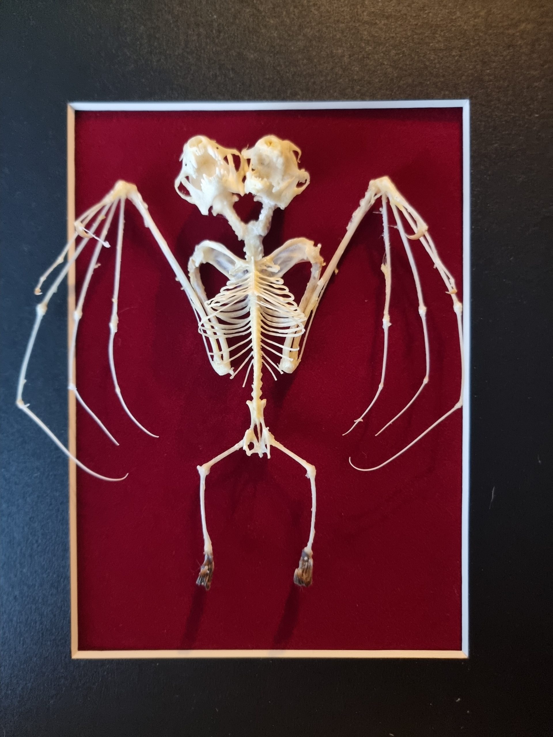 This specimen is an Indonesian Fruit Bat. Coming in a deep frame with black mount board and red velvet effect display, to highlight the skeletal structure.
